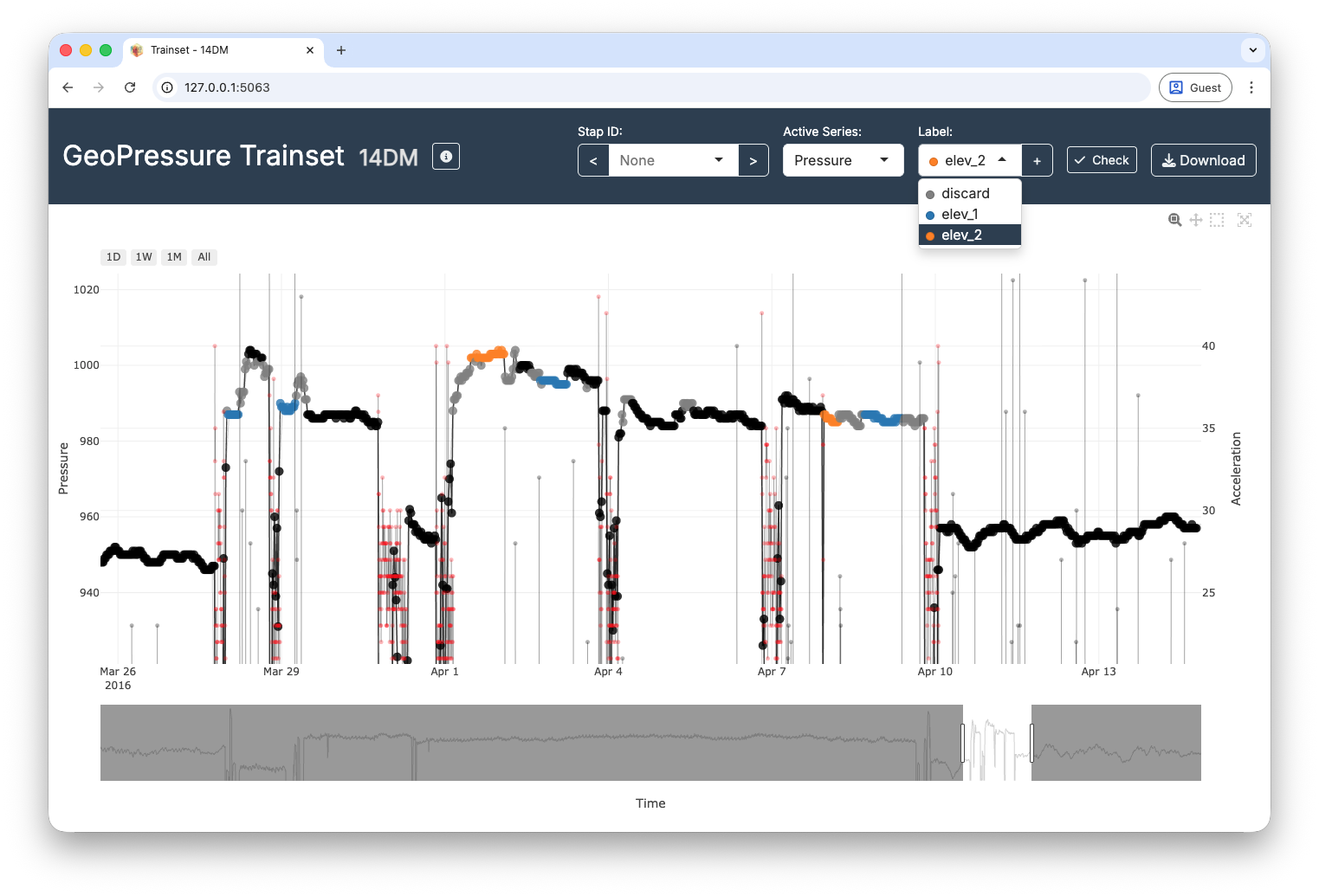 TRAINSET was the original web platform used for labelling. It was built as a customization of the Geocene TRAINSET app, a web-based tool for time-series annotation.