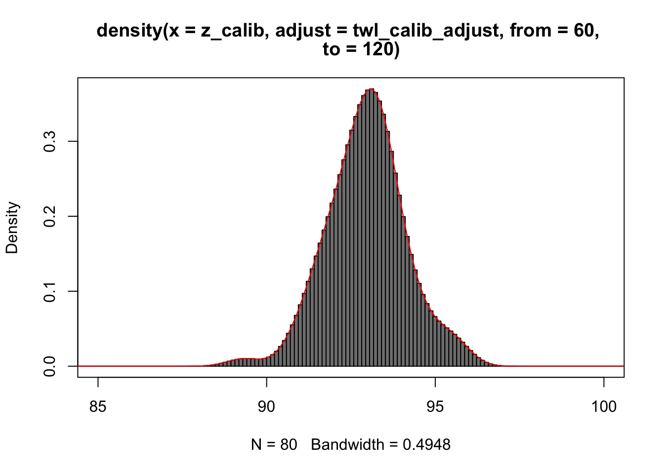 )The twl_calib_adjust parameter adjusts the smoothness of the fit (see stats::density()). Because the zenith angle error model is fitted with data only at the calibration site, and we are using it for all locations of the bird’s journey, it is safer to assume a broader/smoother distribution (twl_calib_adjust > 1).